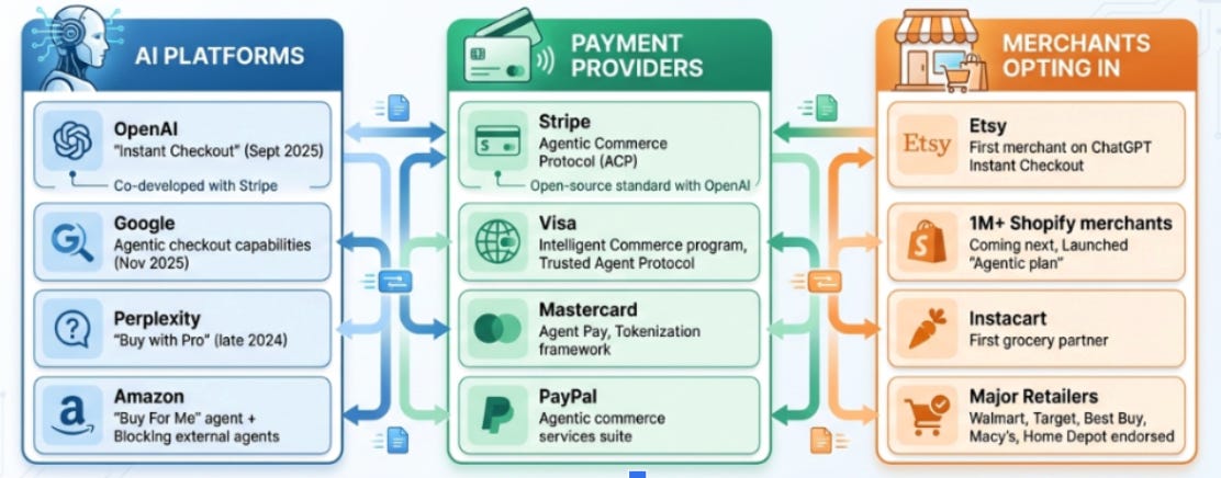 AI platforms are leading the way. OpenAI launched “Instant Checkout” in ChatGPT in September 2025, co-developed with Stripe but only available in the US for now. Google followed with its own agentic checkout capabilities in November. Perplexity had already been there since late 2024 with “Buy with Pro“. Amazon, characteristically, is playing both offence and defence blocking external AI agents from its platform while simultaneously building its own, including “Buy For Me,“ an agent that purchases products from other retailers’ websites within the Amazon app.