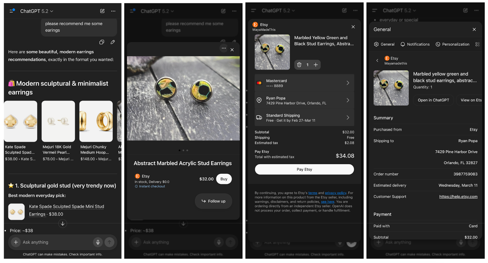 Behind the scenes, the transaction is processed by the merchant platform (in our case Etsy) which acts as the Merchant of Record, meaning Etsy charges your card, handles taxes, and manages fulfillment. ChatGPT simply acts as the interface layer, allowing you to complete the entire purchase without leaving the conversation. Once you order, ChatGPT shows the order status and provides a “View on Etsy” button so you can track, manage, or cancel the order directly on Etsy, with status updates reflected back inside the chat. In our experience the checkout process is very smooth, comparable to shopping on Amazon.