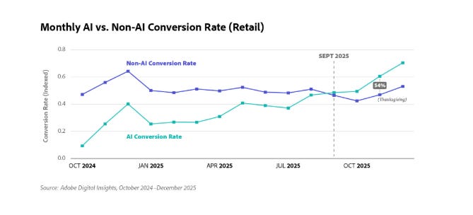The numbers behind this shift are remarkable. Traffic to U.S. retail sites from generative AI sources surged almost 700% year-on-year during the 2025 holiday season (although the user base is still low, the uptick shows the value AI can deliver in the shopping experience). And this traffic seems to be converting a lot higher. Particularly around key events, like Thanksgiving and Black Friday the conversion gap between AI and non-AI widened as shown by the Adobe chart below.