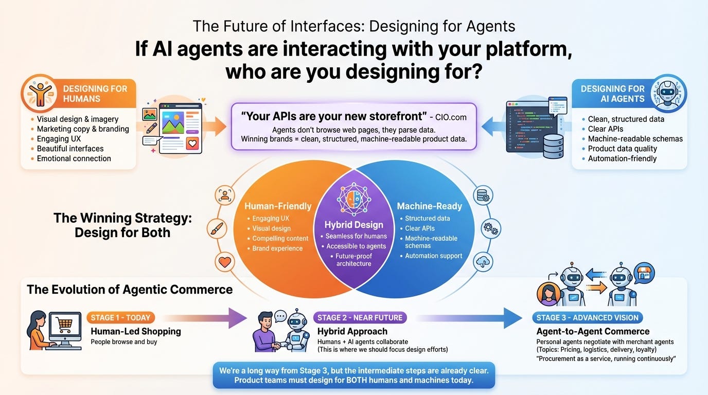 For now, a hybrid approach makes the most sense. Product teams should be designing for both humans and AI agents engaging UX and visual design for people; structured data, clear APIs and machine-readable schemas for the machines.