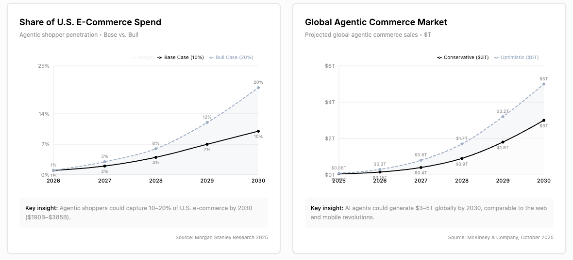 McKinsey projects agentic commerce could drive $3–5 trillion in global orchestrated revenue by 2030. And Morgan Stanley estimates $190–385 billion in U.S. e-commerce spending could be agent-mediated within the same timeframe (reaching between 12% and 20% of US e-Commerce spend)
