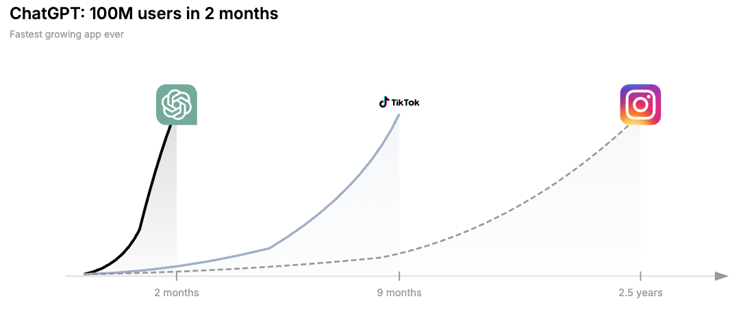 ChatGPT was launched just over 3 years ago and reached 100 million active users in 2 months, making it the fastest growing consumer application in history. By comparison, TikTok took 9 months and Instagram took 2.5 years.